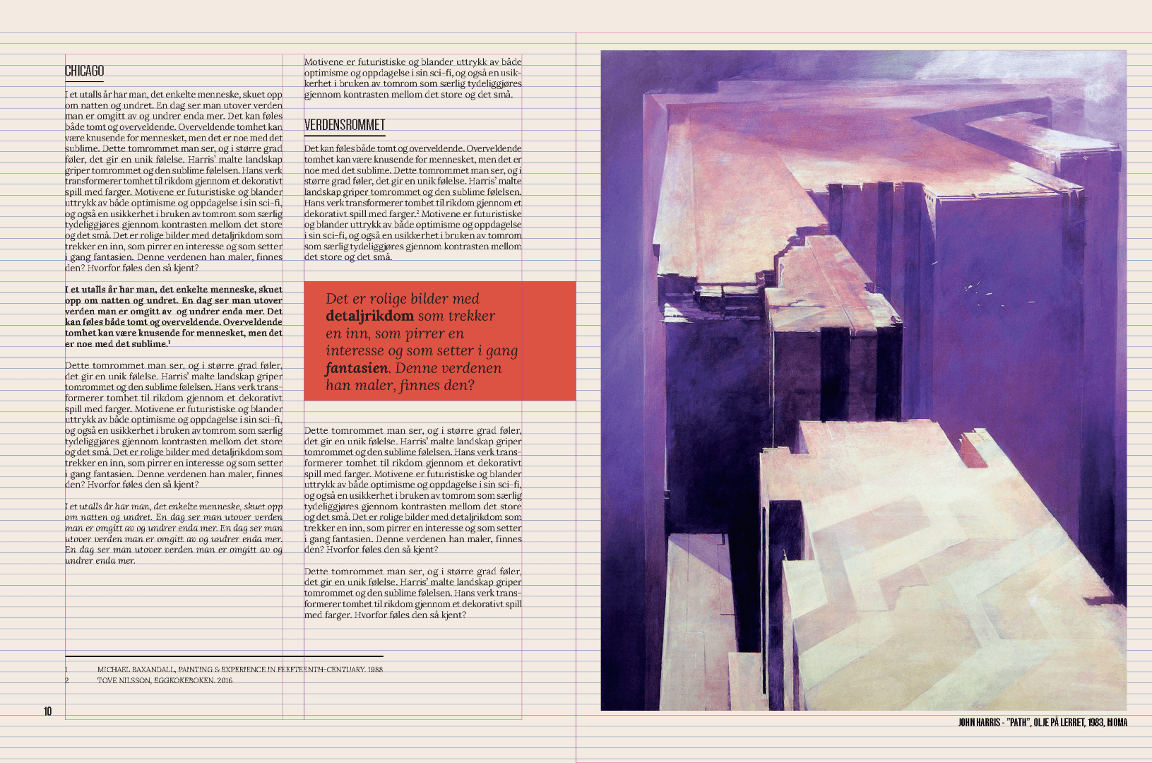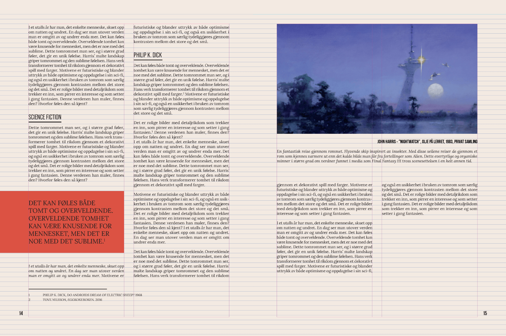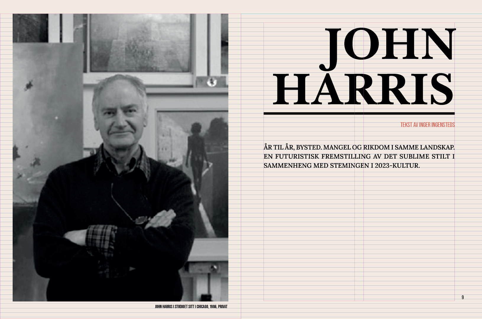 Bilder fra utviklingen av magasinet med underliggende grid synlig og malelementer. Primært er det brødteksten som legger seg til dokumentgridet, mens andre elementer følger linjer trukket ut fra det.