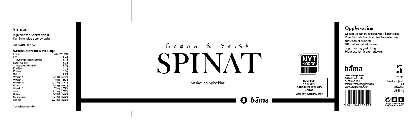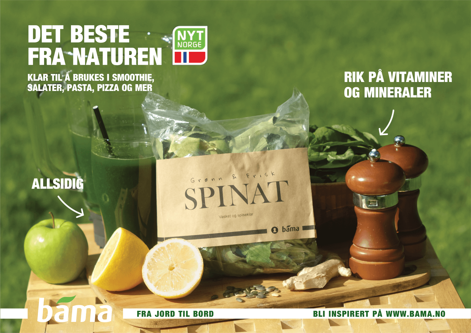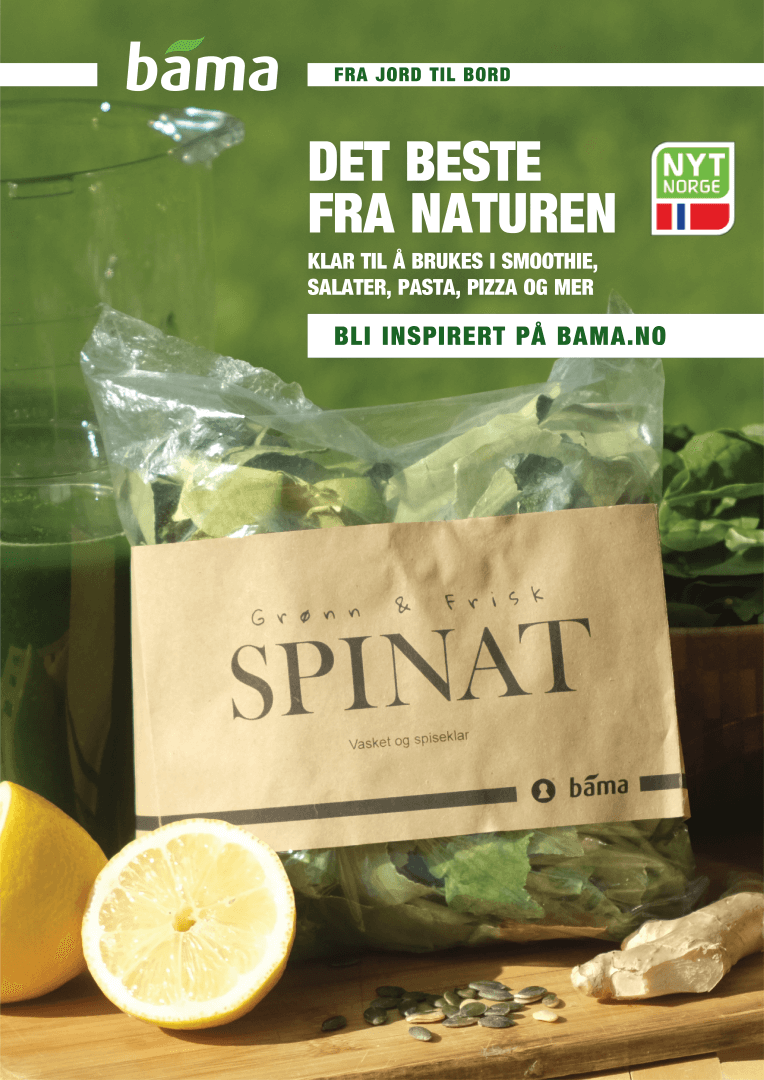 Oppgaven følger Wanda Grimsgaards (professor og forfatter av Design og Strategi (2018)) seks faser for strategisk utvikling av design til å utføre et redesign av Bamas Grønn&Frisk “Super*Spinat”. Designet er forankret i en reduksjonistisk bærekraftsstrategi og utforsker muligheter innen materialer, grafikk og strategisk tilnærming.