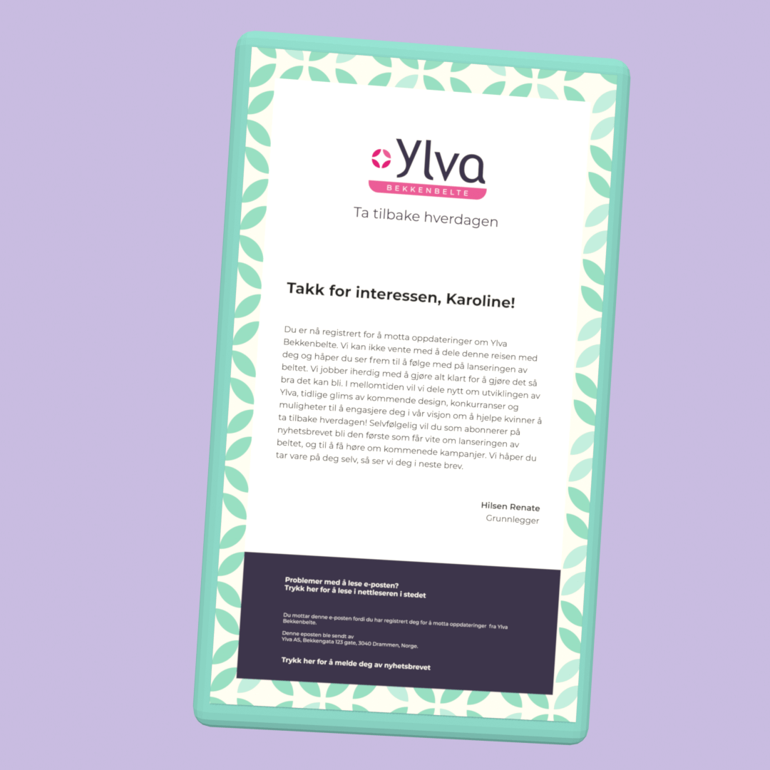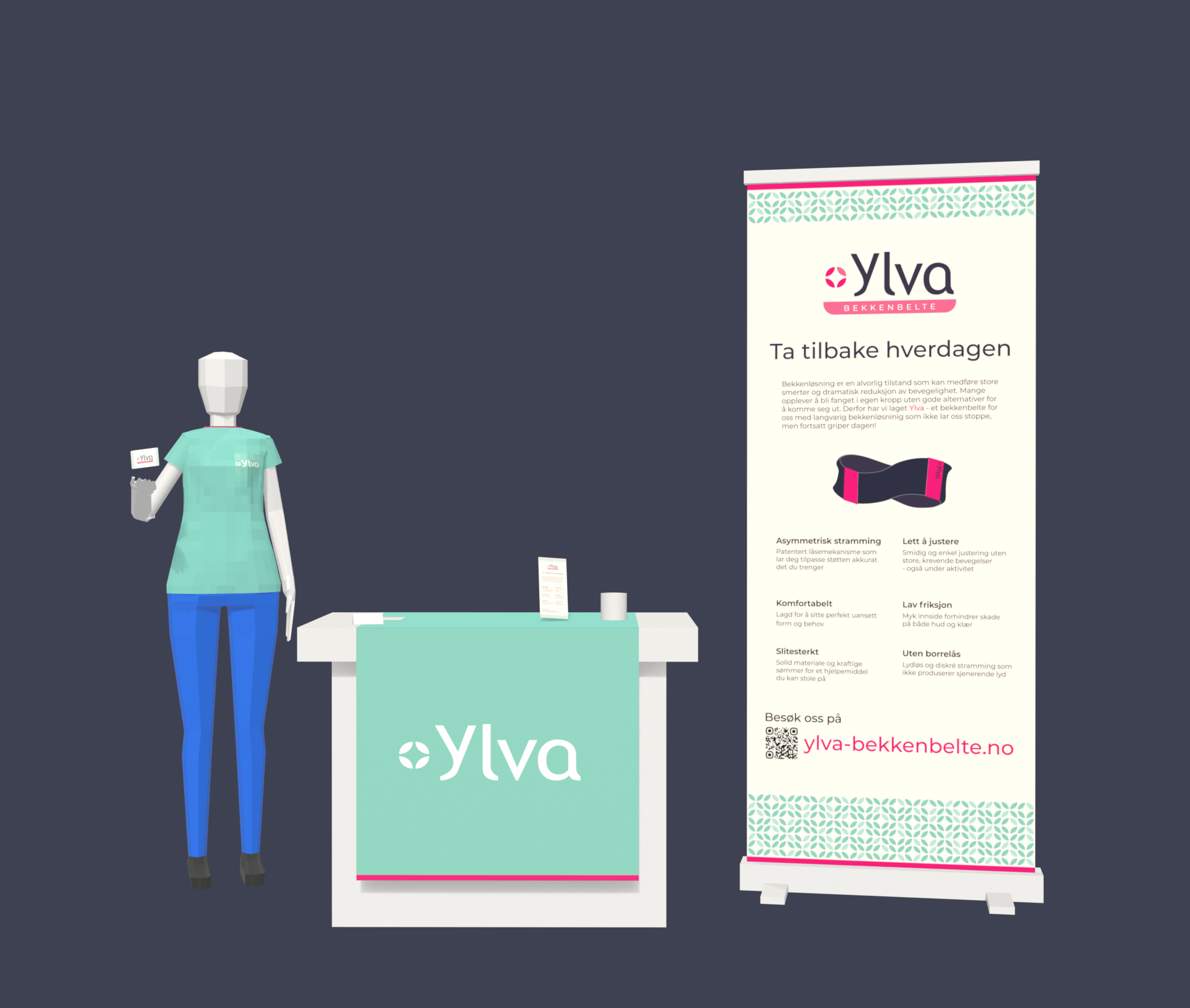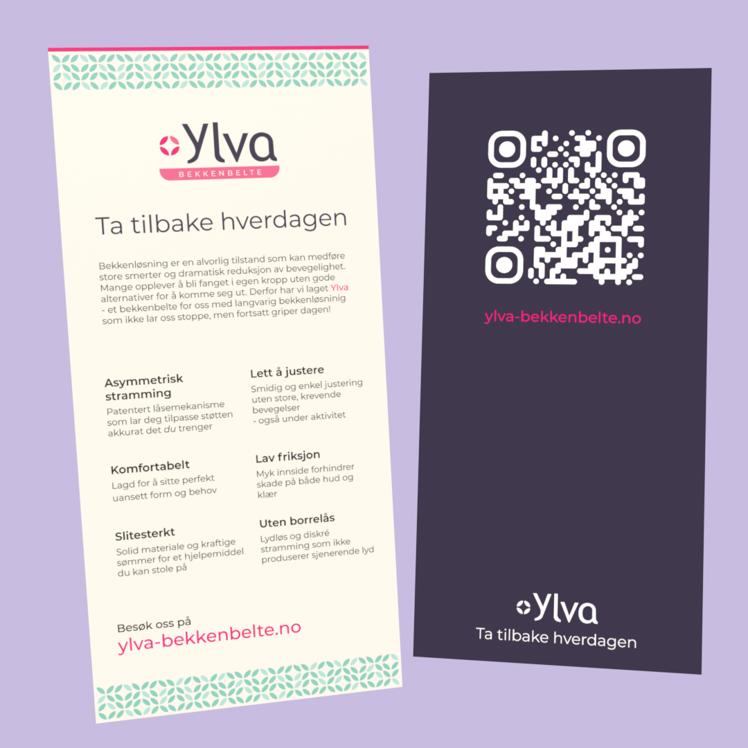 Logo, mønster, fargepalett og typografi, samt føringer for bruk av alle elementene samlet i en designmanual. Disse føringene er også brukt i utformingen av kommunikasjonsmateriale for Ylva som kan brukes før lansering, som event-materiale og nyhetsbrev.