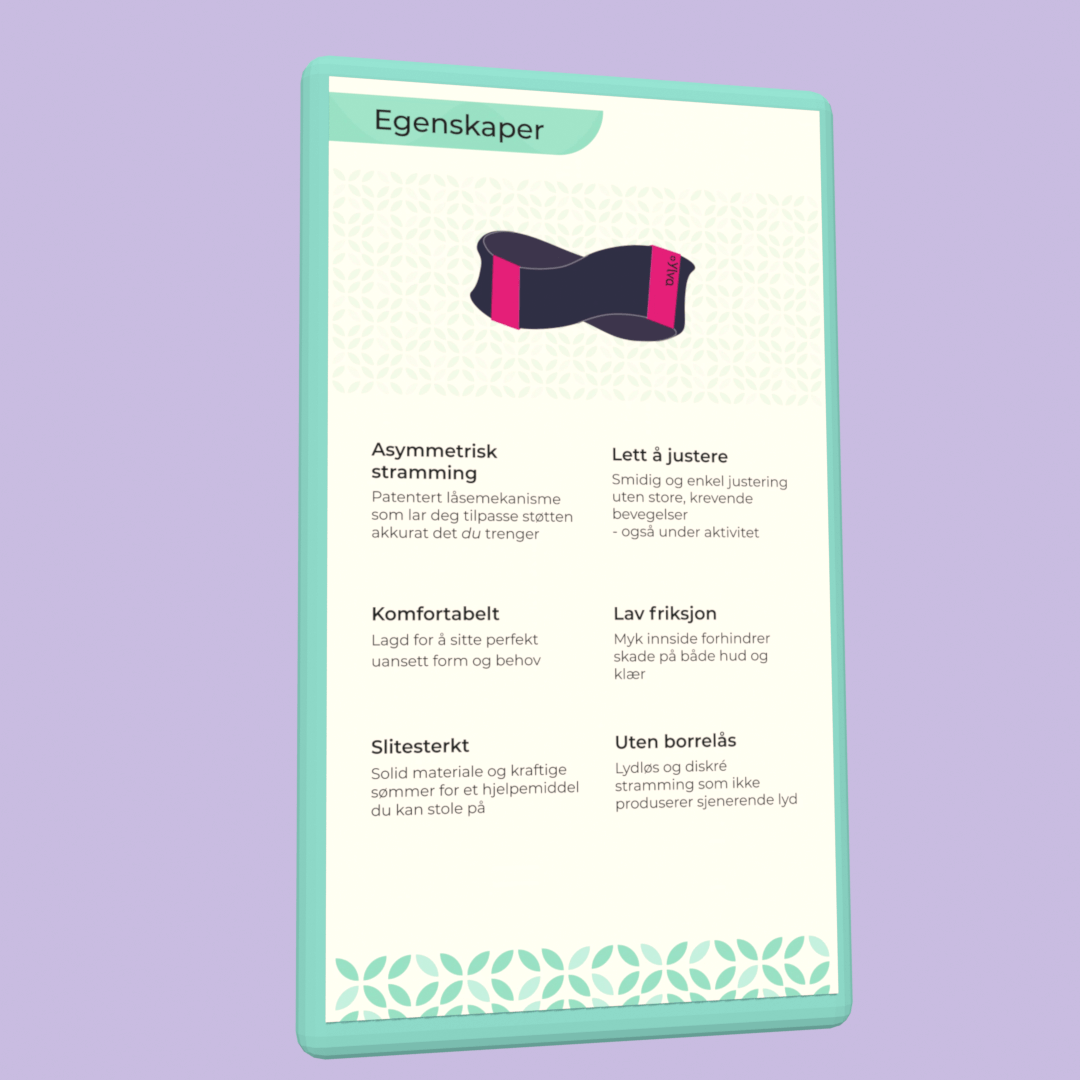 Gjennom strategiske workshops med oppdragsgiveren arbeidet vi med å konkretisere hva merket skulle være: Friskt, sportslig og aktivt; slik at det kunne assosieres med bevegelse og muligheten til en aktiv livsstil. Trygt og troverdig slik at det kan holde en posisjon som et medisinsk redskap som faktisk duger og gir lindring. Det skulle være norsk og bære en arv fra hvor det ble laget selv når produktet lanseres i utlandet. Den norske ånden for friluft og god helse ville være et godt image med stolthet som oppdragsgiveren gjerne ville stå for.